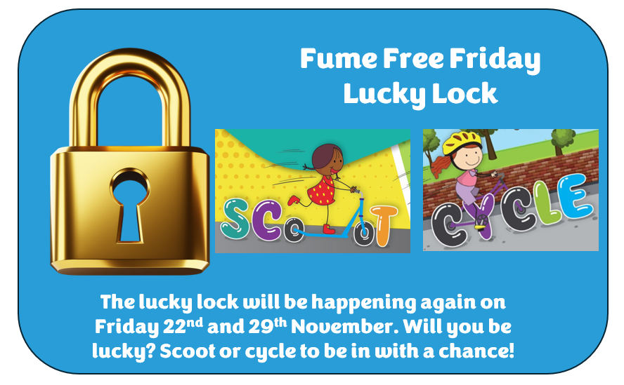 Remember your road safety training on Fume Free Friday. Friday 22nd November is our 4th Fume Free Friday. The lucky lock will be in use for those scooting or cycling to school. For those of you walking, remember to use the Green Cross Code. #RoadSafetyWeek